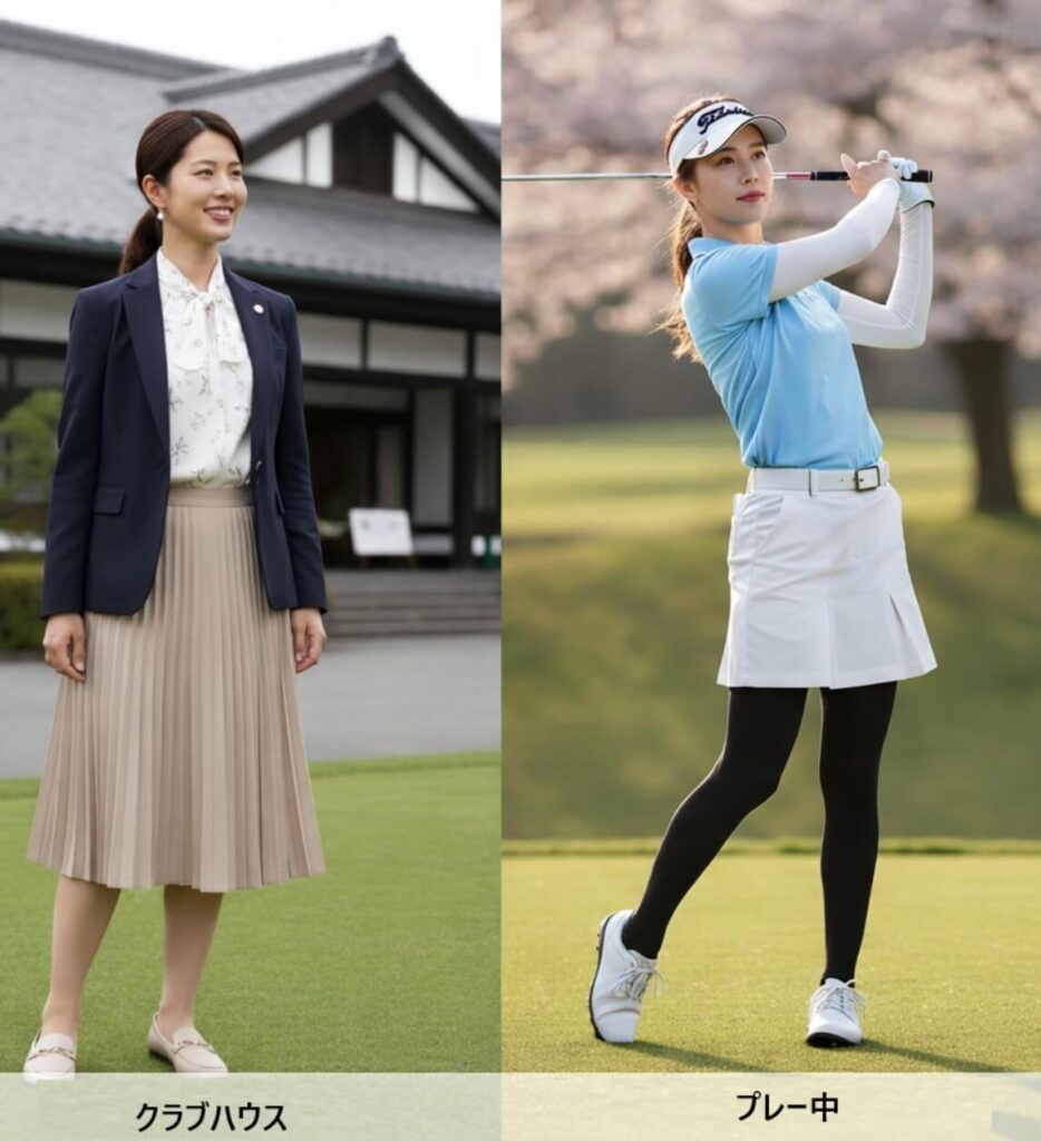 • プレー中:襟付きポロシャツ+ゴルフスカートまたはキュロット(短すぎない丈)+ソフトスパイク、ハイソックスやレギンスは「露出を抑えつつ動きやすい」範囲で。