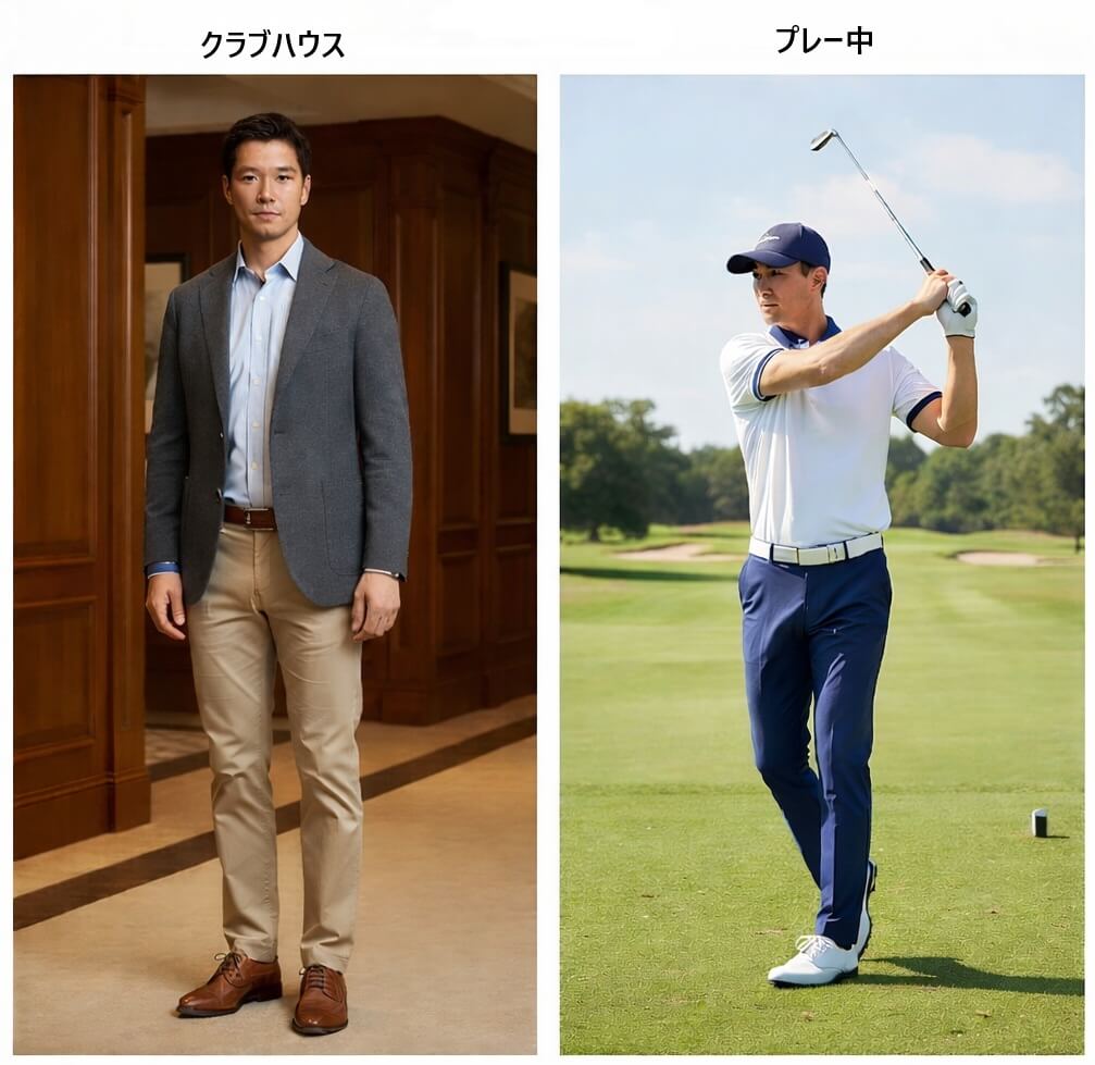 • プレー中:襟付きポロシャツ+ゴルフ用パンツ(またはきれいめチノ)+ソフトスパイクシューズ。